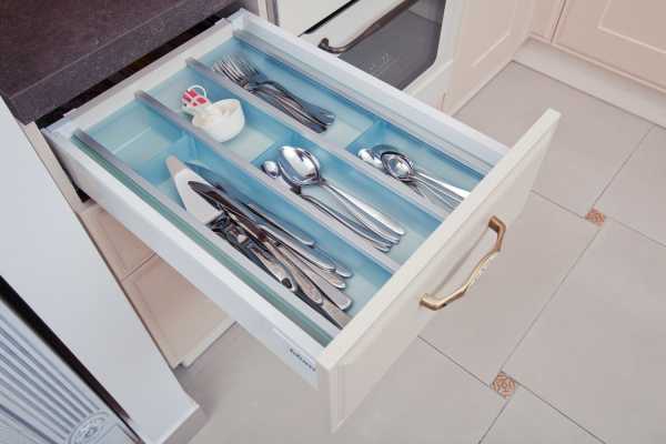 Красивые выдвижные ящики для столовых приборов станут отличным дополнением к интерьеру вашей кухни.