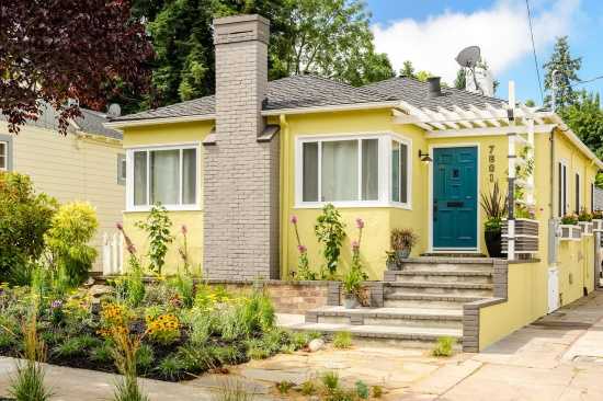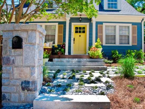 Чтобы сделать небольшой коттедж более приветливым и счастливым на вид, дизайнер выбрал солнечно-желтый цвет для фасада и веселый бирюзовый оттенок для входной двери. Кроме того, изменился дизайн лестницы, добавилась декоративная пристройка под окнами, а требующий постоянного ухода газон сменился на неприхотливый сад с цветами и камнями.