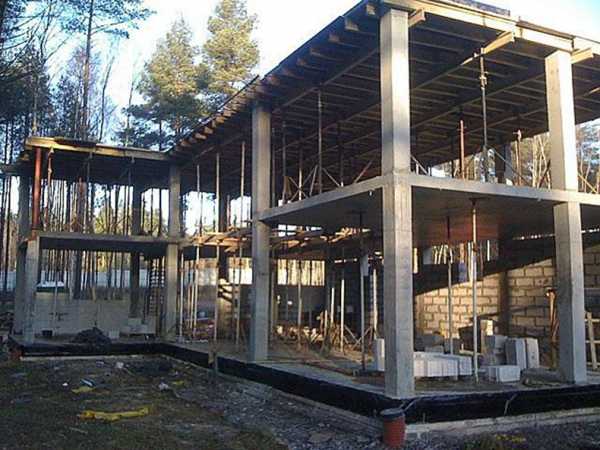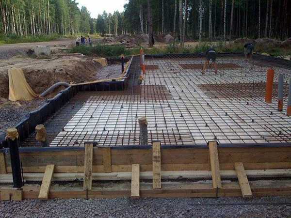 Монолитная фундаментная плита – основа фундамента для данного проекта, она была утеплена пенополистиролом со специальным заведением его наружу, за саму грань фундамента на целую ширину бетонной отмостки. Также была применена обмазка для вертикальной гидроизоляции.