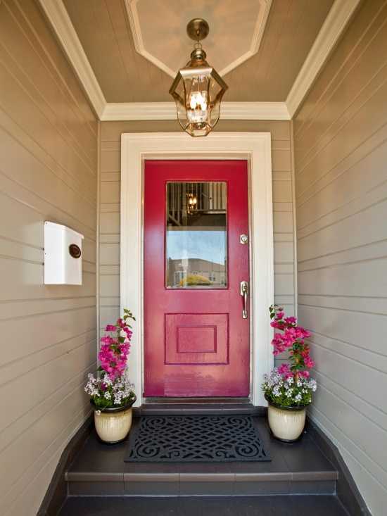 Хороший пример того, как теплые цвета могут кардинально изменить всю обстановку! А чтобы столь необычное сочетание цвета стен и входной двери выглядело уместным, к ним были добавлены подходящие по тону растения и горшки.
