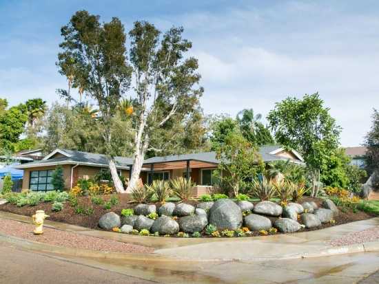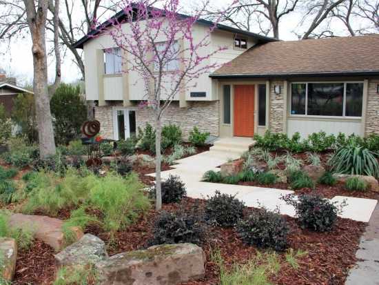 Чтобы сделать эту постройку более привлекательной, дизайнер догадался применить светлую нейтральную цветовую палитру, которая намного лучше сочетается нижней частью дома, выложенной камнем. Также хозяева данного жилища пожелали иметь неприхотливый сад, не требующий постоянного ухода, поэтому теперь мы видим в нем валуны, чередующиеся с кустиками местных засухоустойчивых растений, и очаровательное цветущее дерево багрянника канадского.
