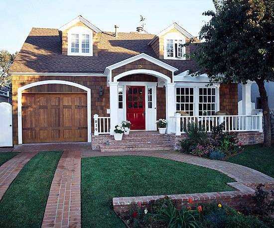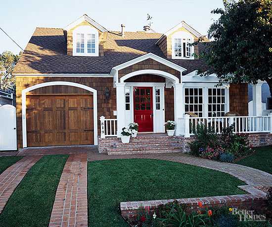 Арочный портик над новым кирпичным крыльцом и прилегающая к нему беседка придают этому дому не только радушный, но более комфортабельный и изысканный вид. Старые ставни и гаражная дверь смотрелись как неаккуратные белые пятна на красном фоне. На смену им были установлены тонкие белые молдинги и перила, которые красиво выделяют окна и двери и гармонируют с дорожкой из красного кирпича.