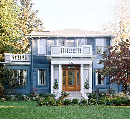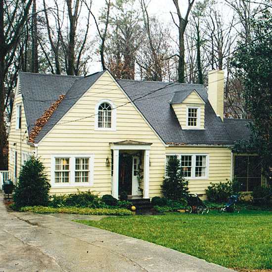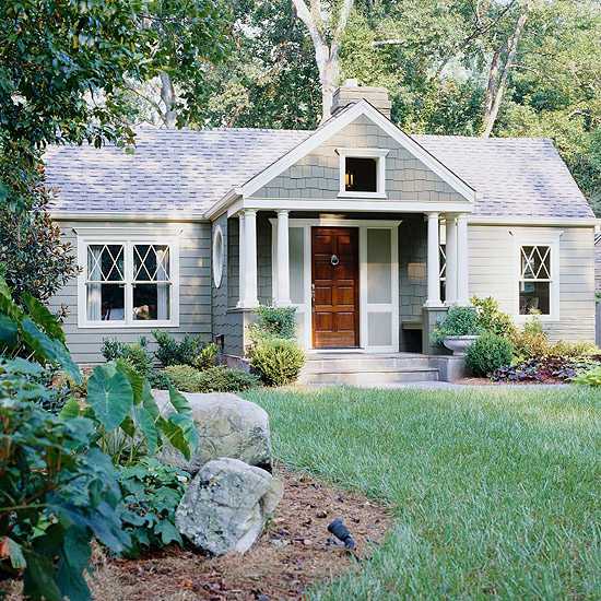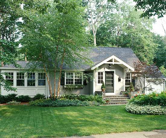 Как сделать внешний вид дома более приветливым, но при этом сохранить деревья, которые его закрывают? Первый шаг к открытости — это избавление от мрачного забора и обустройство широкой дорожки, ведущей к дому. Далее, вслед за забором, нужно избавиться от холодных и темных красок, сменив их на более жизнерадостные цвета, и ярко выделить входную дверь. Взгляните на следующие фото: в какой из домов вам больше хочется заглянуть с визитом?