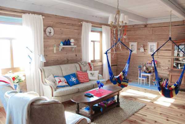Мода на рустикальный интерьер появилась несколько лет назад и прочно укрепилась в мире дизайна. По желанию хозяев именно в этом стиле были оформлены комнаты дома. Немного грубоватая, но очень уютная мебель, гамаки из цветной ткани, пол, стены и потолок выложены досками. Такой интерьер прекрасно подойдет тем, кто живет сегодняшним днем, но не отказывает себе в удовольствии время от времени погружаться в легкую ностальгию по проведенному в деревне беззаботному детству.