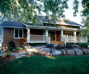В отличие от примера № 3, при обновлении дизайна этого дома было принято решение спасти растущие здесь деревья путем строительства массивной бетонной опоры с деревянными перилами. Хозяева дома только выиграли от таких изменений, поскольку получили в подарок просторную веранду с деревянным полом.