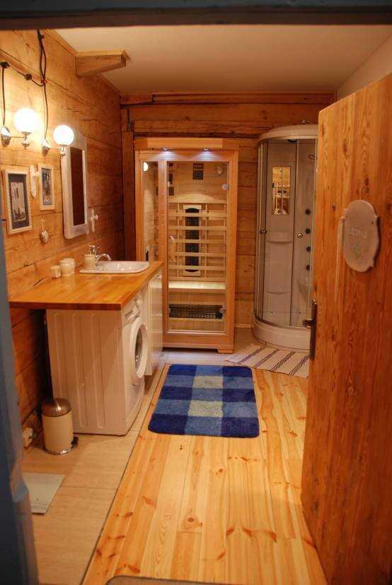 Новые хозяева дома всем другим материалам предпочитают теплое и уютное дерево. В этой ванной комнате, как и во всех других помещениях дома, пол и стены выполнены из светлого дерева. В качестве контраста выступают современные стиральная машина и большая душевая кабина с поддоном.