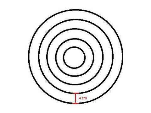 Как видите, каждая группа на 5 мм меньше, чем предыдущая. После того, как вы нарисуете каждый из этих дисков, с помощью линейки отмерьте 4 см (по линии радиуса) от внешнего края окружности. С помощью циркуля нарисуйте по отмеченной метке окружность меньшего радиуса. Таким образом, у вас получится круглая полоса шириной 4 см. Опять же, измерьте 4 см от внешнего края нового круга, и, начиная от центра диска, нарисуйте с помощью циркуля ещё один небольшой круг. Продолжайте этот процесс, пока у вас не получится 5 дисков один в другом. Как уже было сказано ранее, на последние группы, вероятно, придётся по 4 диска вместо 5, потому что последний диск получится слишком маленьким.