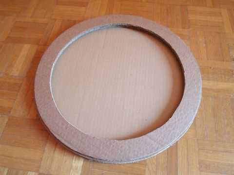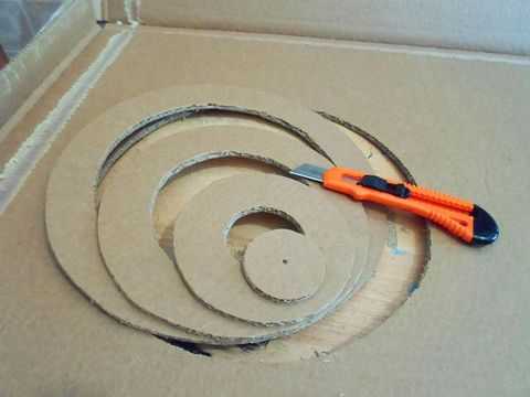 На материале чертятся диски, диаметр которых варьируется от 18 до 21,5 см. Каждый следующий круг больше предыдущего на 0,5 см. Толщина кольца получается в пределах 0,4 см. На фото ниже наглядно изображен описанный процесс: