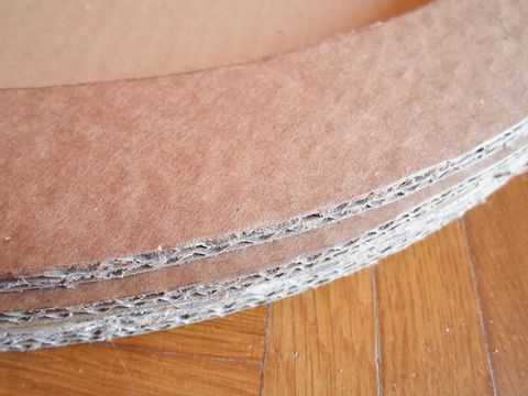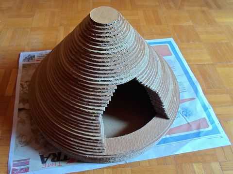Чтобы сделать оригинальную конусообразную конструкцию домика, потребуется гофрированный многослойный картон толщиной примерно 6 мм. Чем больше слоев будет в картоне, тем большей прочностью характеризуется укрытие для кошки. Из инструментов понадобится: