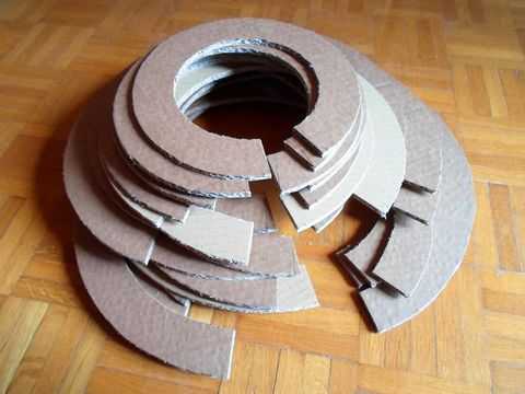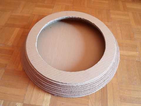 Теперь давайте попробуем составить основание картонного домика для кошки. Положите все эти большие кольца на диск основания, а также добавьте сверху самое большое кольцо из группы 1.