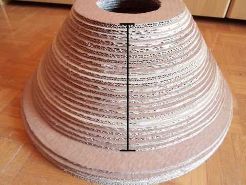 Чтобы не повредить картонное основание домика, уберите составляющие его диски в сторону. Затем отсчитайте снизу вверх 20 слоев кругов из картона. Оставшиеся сверху детали уберите. Не волнуйтесь, это ненадолго.