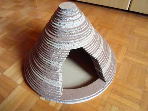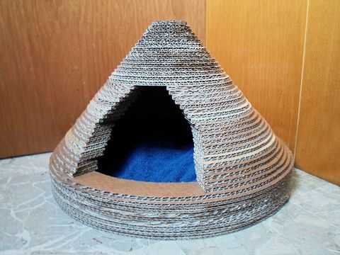Если у вас в доме живет кошка, то вы наверняка знаете, что ей нравится уединяться во время отдыха. Место для отдыха кошки выбирают исходя из своих соображений, чтобы было уютно и никто не тревожил: в (на или под) шкафу, под кроватью, в корзине для белья и даже в стиральной машине. Если же вы хотите создать любимому питомцу своё уютное гнёздышко, сделайте домик для кошки из картона. Весь домик будет сделан из картонных слоёв, наложенных друг на друга. И хотя вам придётся покорпеть над изготовлением нового жилища для домашнего любимца, но зато оно того стоит! Вы сделаете своими руками домик для кошки с уникальным дизайном, и даже сам процесс изготовления доставит вам удовольствие.