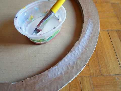 Процесс склеивания начинайте с основания кошачьего домика. С помощью кисточки нанесите на склеиваемые поверхности тонкий слой клея ПВА. Если клей густой, разведите его небольшим количеством воды. Приложите меньшее кольцо сверху на большее, тщательно отцентрируйте детали из картона и прижмите на 5-10 секунд. Старайтесь не сдвигать склеенные картонные кольца до полного высыхания клея.