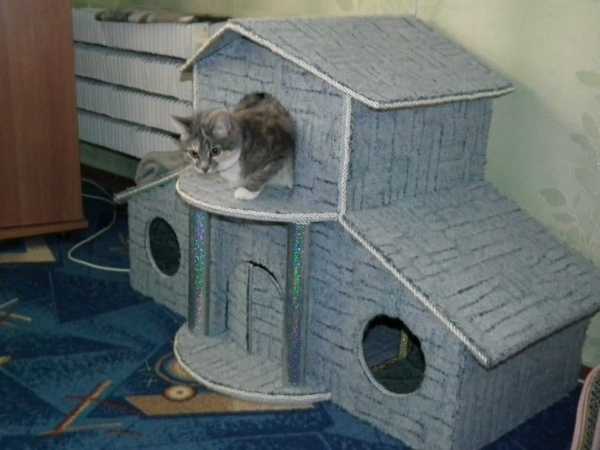 Домик из картона для котаЭто еще один демократичный выход из положения. Такие домики не совсем практичны, т.к. довольно быстро выходят из строя. Но безграничная любовь хозяев к своим питомцам вынуждает потакать этой кошачьей страсти к коробкам. Домик делается легко и быстро. Можно построить даже настоящие двухэтажные апартаменты, если добавить еще одну коробку. В стенках можно прорезать небольшие окошки. Дно домика лучше зафиксировать на деревянной или фанерной подставке, чтобы он не опрокидывался. Если подключить фантазию, из большого количества коробок можно соорудить настоящий замок.