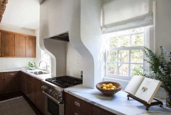 - Отделайте стены штукатуркой кремового цвета, а зону мойки – светлой керамической плиткой, можно без декора.