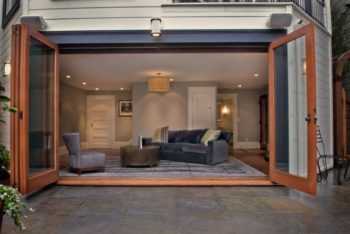 То есть, получиться так сказать дом с видом на террасу. Если же речь идет о замене стены стеклянной панелью, то конечным результатом станет просто большущее окно вместо ворот. Кому-то подобный вариант покажется чересчур открытый, поэтому многие останавливаются на переоборудовании ворот раздвижной системой створок.