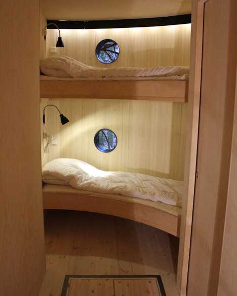 Два отдельно стоящих помещения площадью 21 кв. м каждое размещены на высоте 4 м. В них есть все необходимые для жизни коммуникации и даже кладовая. Дома построены из ламинированной древесины, которая внутри дома выглядит вполне естественно. Твердые сборные пятислойные еловые панели используются для возведения стен, потолка и пола.