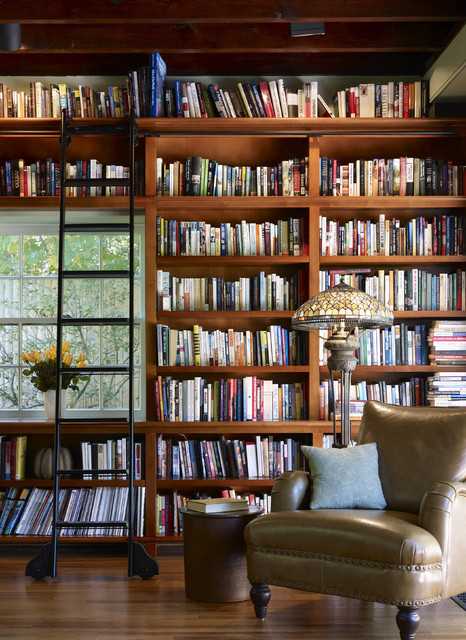 Ваша домашняя библиотека может стать простым уголком для чтения с книжными полками, доходящими до потолка.