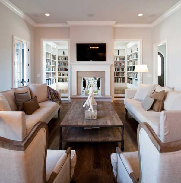 Второй, не менее привлекательный вариант, это домашняя библиотека в гостиной. Такое решение будет особенно интересно тем, у кого нет свободной комнаты для домашнего кабинета.