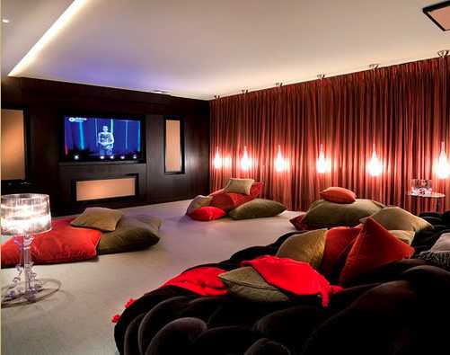 - Голливудская роскошь. Если хотите предать зоне домашнего кинотеатра экстравантности и роскоши, используйте для отделки плюшевую ткань красного цвета. Мягкая мебель должна быть того же тона, что и отделка.