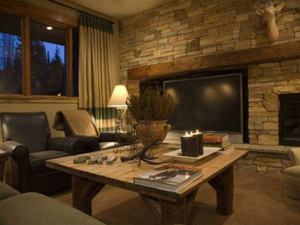 При отделке гостиной с домашним кинотеатром можно использовать натуральное дерево и дорогой текстиль