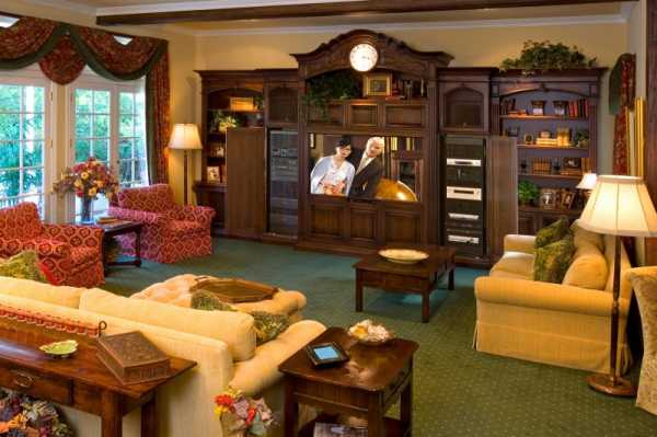 В гостиную классического стиля тоже можно найти способ внедрения домашнего кинотеатра, но сделать это гораздо труднее. Например, в этом случае колонки, проектор и другую аппаратуру можно спрятать в специальных архитектурных нишах. А телевизор можно разместить в корпусной мебели. За ненадобностью он закрывается дверцами.