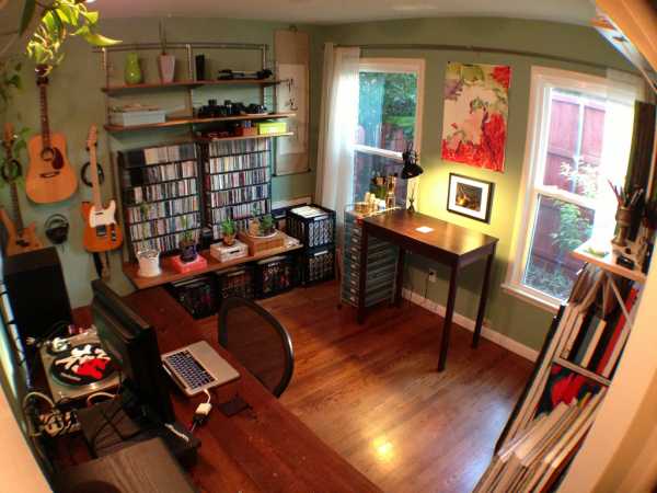 Если вам удалось выделить под студию отдельную комнату, ее нужно оформить минимальным набором мебели, а еще лучше — украсить и добавить уюта. Для работы за компьютером вам понадобится вместительный стол и комфортный стул. Отдельно можно поставить табуреты и стулья для игры на музыкальных инструментах и кресла или диванчик для отдыха. Обилие мягкой мебели улучшает акустику, а твердые поверхности (например дверцы большого шкафа) будут ухудшать ее.