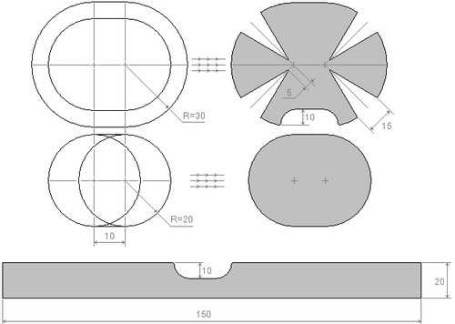 Делаем основание — рисуем два круга радиусом 20 см, отступ между центрами — в 10 см. Длина круга в этом случае получается около 150 см. Бортик делаем высотой 20 см, вырез для входа глубиной 10 см, и такой же вырез в крыше.