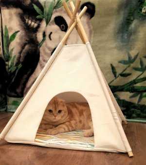 Можно сделать домик в виде вигвама. Коты любят прятаться в коробках, пакетах — им такие картонные домики должны понравиться.