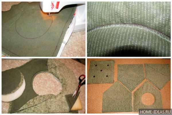 Каждую заготовку делают по принципу «слоеного пирога»: обивка, наполнитель, подклада. Все три слоя сшивают между собой по периметру. Затем в нужном порядке сшиваются и детали домика. Помните о том, что ткань для внешней отделки должна оказаться снаружи, а для внутренней — внутри. Если детали имеют несимметричную форму, то обратите внимание на расположение слоев до вырезания.