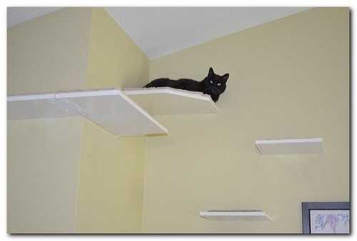 Коты любят высоту и хороший обзор, который обеспечивается удобными площадками, размеры которых должны быть настолько большими, чтобы кот мог лечь полностью вытянувшись, при этом не упасть.