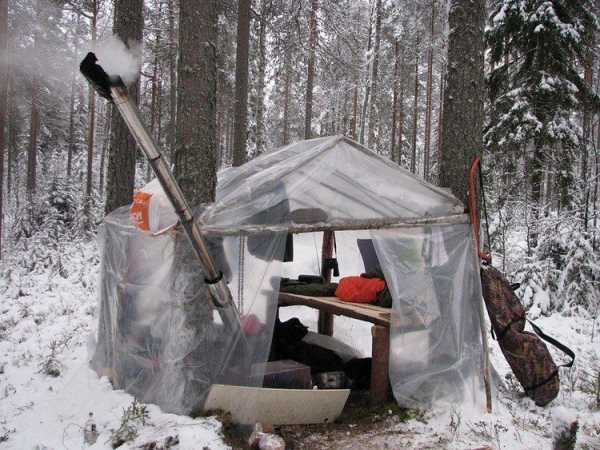 И незамедлительно приступает к строительству небольшой времянки, чтоб было где обсохнуть, приготовить пищу и переночевать. Пока автор сплавлялся по реке уже стало смеркаться. В лесу из найденных сосновых жердей на скорую руку соорудил каркас будущего убежища.