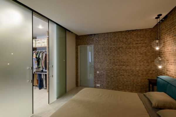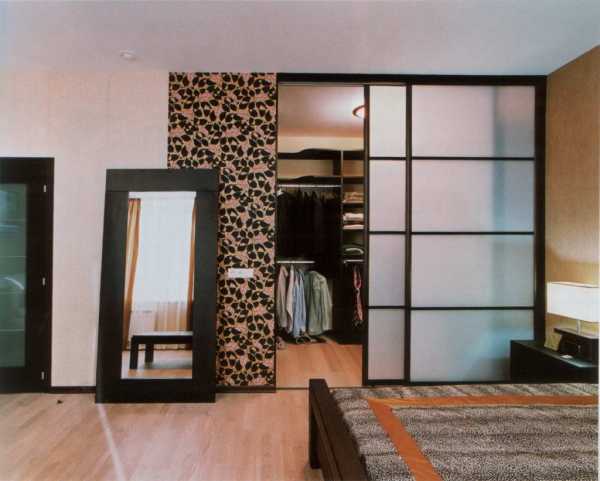 На фото спальня и гардеробная с раздвижными дверями, выполненными из матового стекла.