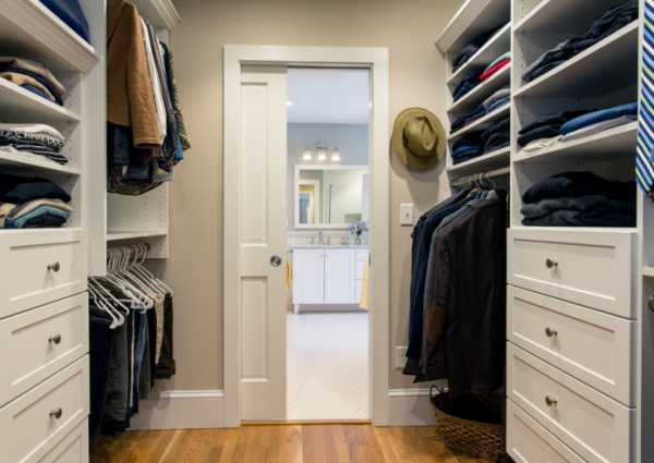 Не старайтесь вместить в проходную гардеробную все свое имущество – некоторые вещи будет уместнее хранить в большом шкафу (в прихожей или в чулане). Все-таки спальня с ванной – приватная зона, и, согласитесь, совсем необязательно размещать здесь уличную обувь, норковое манто или скейт-борд.