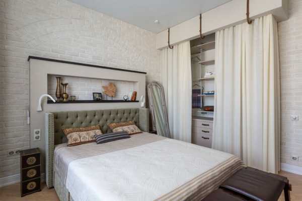 На фото интерьер спальни с тканевыми полотнами в качестве гардеробных дверей.