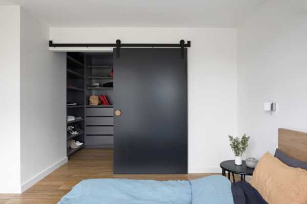 На фото гардеробная с навесной матовой дверью черного цвета в интерьере спальни.