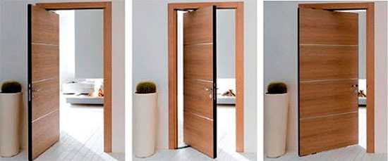 - Рото-дверь. Пожалуй, наиболее футуристская конструкция. Основана она на поворотном механизме. Иными словами, дверь может вертеться вокруг своей оси, открываясь в разные стороны. Однако такая модель требует не меньше места, чем дверь обычная.
