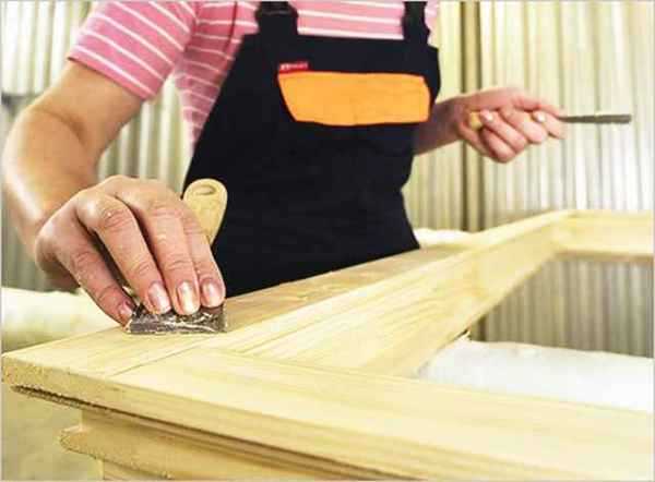 - Удалить старую краску, слой шпатлевки и грунтовки вплоть до древесины. Для облегчения работы можно использовать шлифовальную машинку, наждачной бумагой, специальной смывкой для дерева.