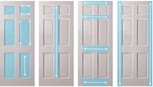 - Филенчатая дверь. Сначала с помощью кисти окрашивается все углубления в полотне. Важно не допускать излишков краски. В завершении – вся дверь окрашивается валиком, придерживаясь поочередности покраски щитовой конструкции.