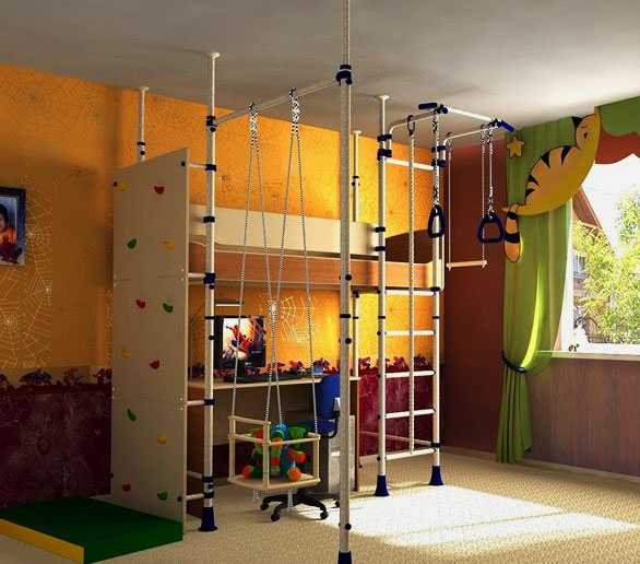 - со спортивным уголком: кровать дополнительно оборудована шведской стенкой с перекладинами или турником, что делает утреннюю зарядку очень удобной и приятной процедурой, особенно хороши такие конструкции для подростков – регулярные занятия на перекладинах помогают сформировать правильную осанку;