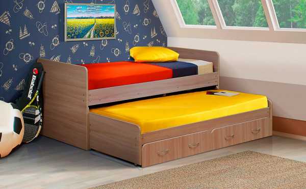 - выдвижная (кровать-матрешка). Такая конструкция представляет собой высокую кровать, под которой установлено дополнительное спальное место, которое выдвигается при необходимости. На такой кровати можно спать даже тем, кто боится высоты, а так же ее допустимо устанавливать в комнатах с низкими потолками. Кроме того, такая конструкция считается менее травмоопасной по сравнению с другими видами двухъярусных кроватей;