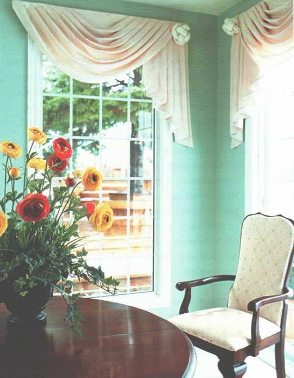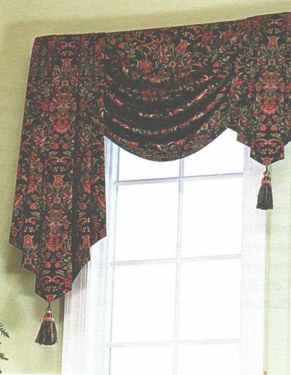 Если вы хотите, чтобы жабо и сваги в украшении окна выглядели гармоничным продолжением друг друга, они должны быть выполнены из одной ткани. Для подкладки следует использовать тоже декоративную ткань, можно другого цвета.