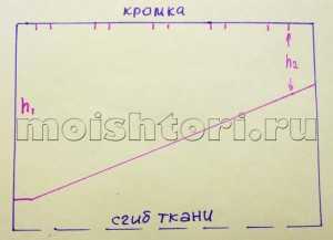 Острые углы по длинной стороне детали я не люблю, поэтому, отметив высоту h2, я от этой точки провожу горизонтальную линию около 10см и только потом плавно заворачиваю линию низа и провожу прямую через точку, отмечающую высоту h3.
