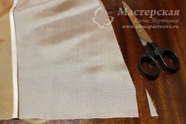 1. Выкраиваем де жабо по расчетным размерам или готовой выкройке. Если требуется по модели, пришиваем к нижнему краю контрастную полосу ткани. Со стороны длинного края де жабо срезаем уголок припуска на обработку перпендикулярно к боковому срезу.