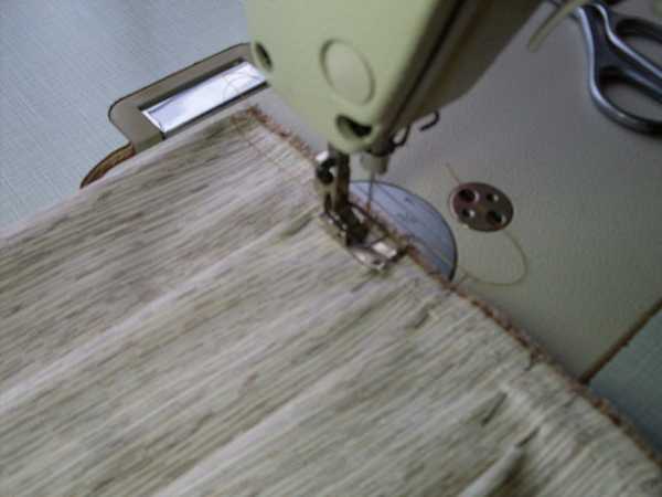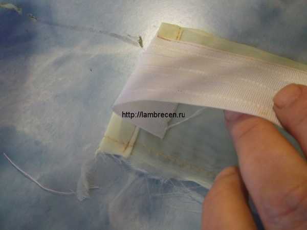 Обметываем не обработанную сторону планки (там, где мы скрепляли ее строчкой), оставляя расстояние от края тесьмы в пределах 0,5-1см для того, чтобы пришить планку к ламбрекену: