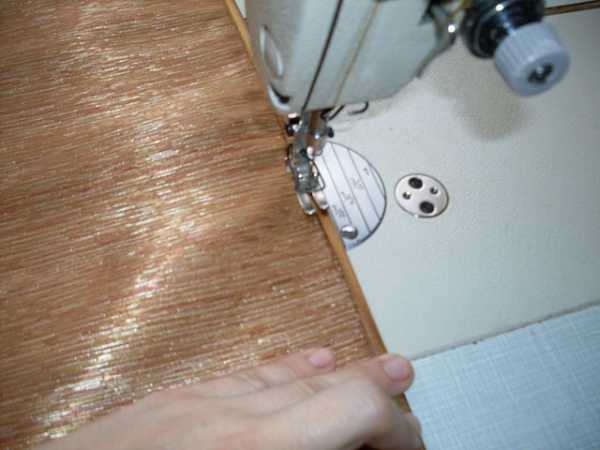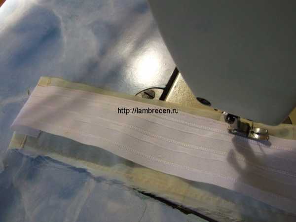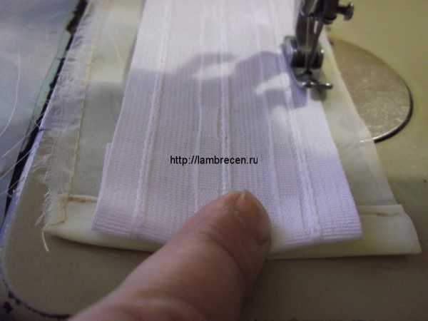 Переворачиваем нашу планку так, чтобы и ламбрекен и планка были лицевой стороной к Вам и прокладываем строчку, посматривая, чтобы и с низу прихватить строчкой шторную ленту. Если у Вас пока сразу не получается, то лучше прежде наметать: