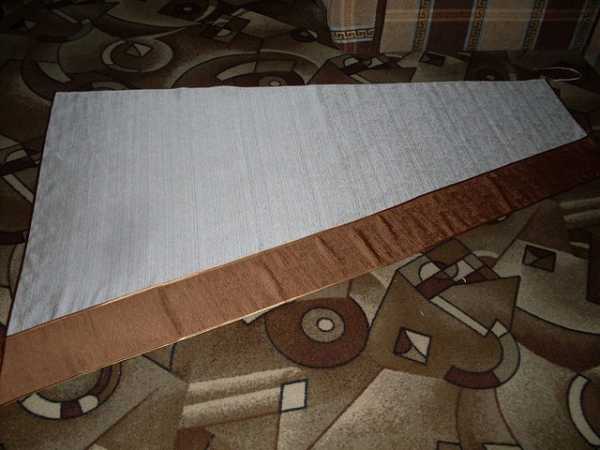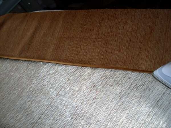 Для этого мы отрезаем полосу ткани по длине равный длине ламбрекена + 6 см на обработку, и по ширине, равный ширине шторной ленты, умноженной на 2, плюс 4см на обработку. Длина нашего ламбрекена-2м + 6см = 2,06 м-это длина нужной нам полоски ткани на планку для ламбрекена. Так, как я имею шторную тесьму шириной 5 см, то умножив на 2 и прибавив 4 см. получаю ширину нужной нам полосы -14см. И так, кроим полосу ткани для нашей планки длиной 2,06 м и шириной 14см, складываем ее пополам по всей длине и проутюживаем: