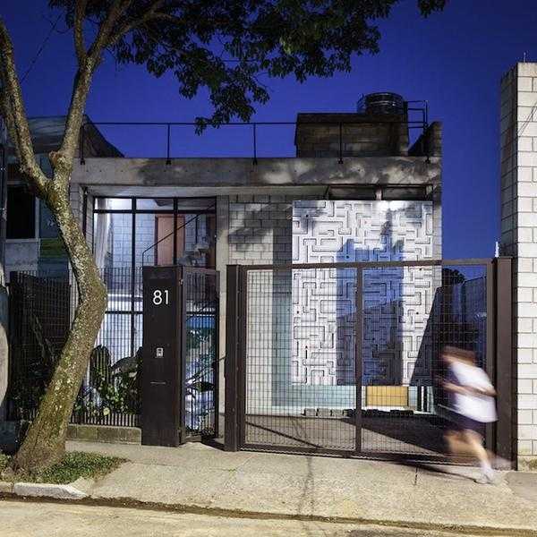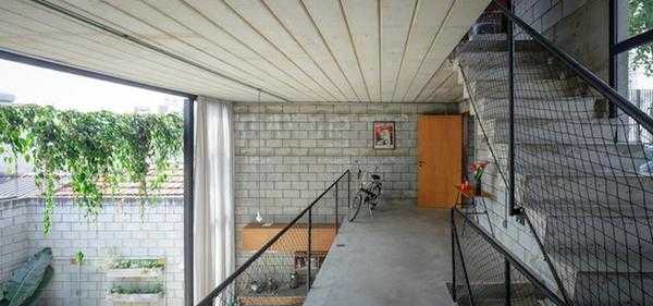 Бразильская дизан-студия «Terra E Tuma Architects» разработала интерьер этого необычного дома, расположенного Сан Паулу. Его особенность заключается в том, что интерьеры помещений выполнены в стиле лофт с применением большого количества озеленения и нестандартных конструктивных решений. Стены строения выполнены из кирпича и бетонных блоков и внутри ничем не облицованы. На фоне светло-серого бетона прекрасно выделяется множество конструкций из покрашенного в черный цвет металла. Сюда можно отнести рамы окон, металлоконструкции стеклянных перегородок, ограждения лестниц и балкона, расположенного на втором этаже гостиной. Весь этот индустриальный шарм контрастирует с большим количеством «зеленых» зон, а гостиная, объединенная с кухней, частично выходит прямо под открытое небо.