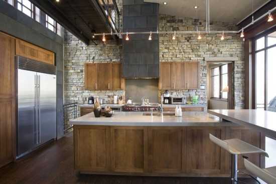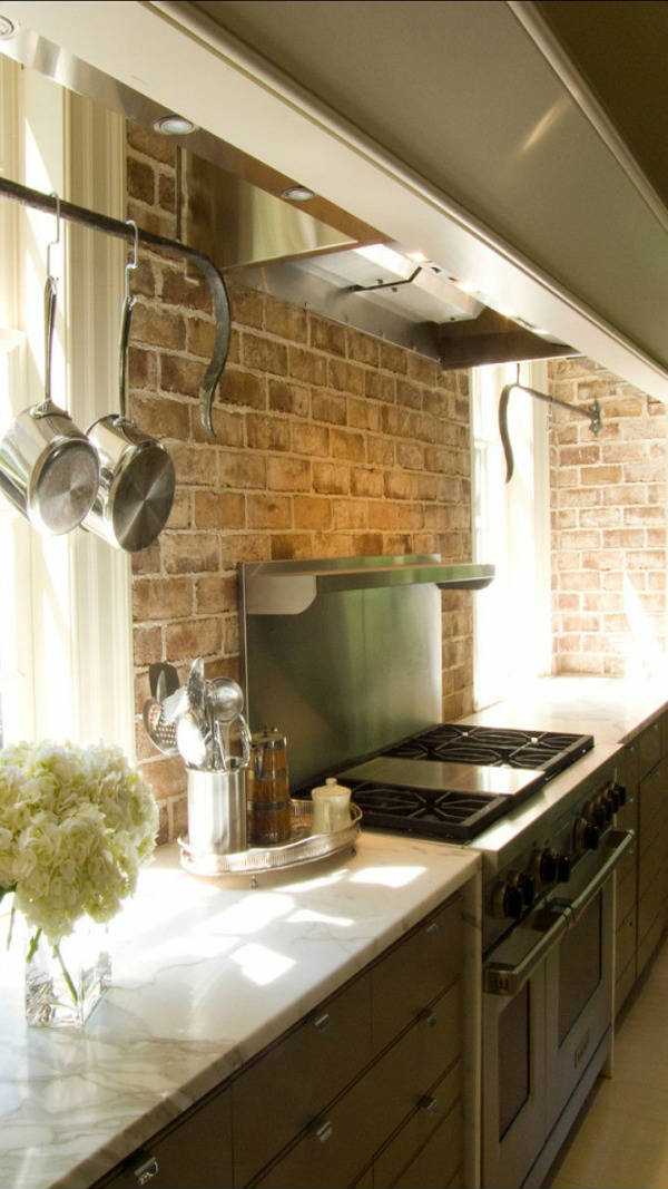В кирпичной кладке можно найти разнообразнейшие оттенки: от яркого терракотового до серого или белого. Этим воспользовались хозяева следующей кухне, совместив с серыми столешницами искусственно состаренную кирпичную кладку-фартук.