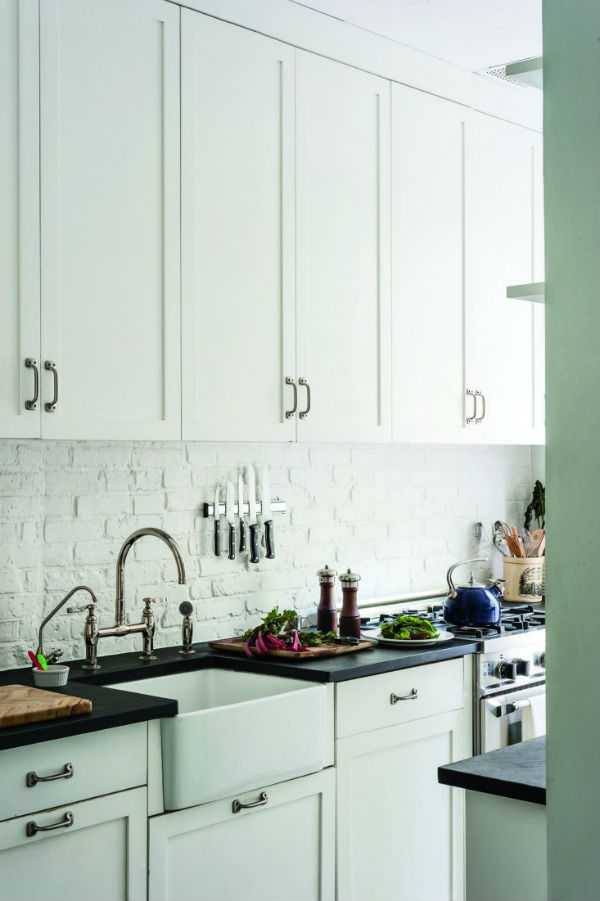Еще один фотопример – уютная кухня с побеленной кирпичной кладкой, которая придает интересный вид интерьеру и отлично сочетается с белыми стенами и мебельными фасадами.